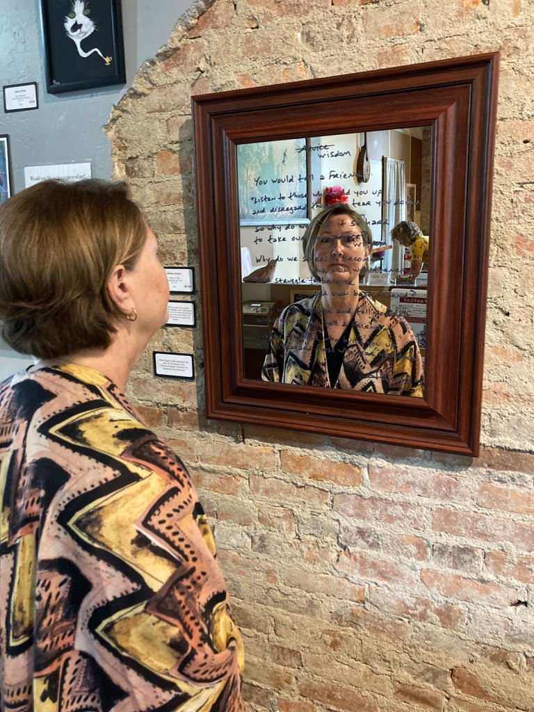 The poem was originally entitled “advice,” but I often re-fresh poems when I join them with artwork as a new day brings me to a new place of being. In general, I quite enjoy breaking words apart and the first time I wrote the title on the mirror it struck me as “add-vice.” Why would I want to “add to the vice” of ill emotion? “Wisdom” immediately came to mind. A “wise kingdom.” Might that be where a best friend would reside? Yes, that felt like a more fitting title.